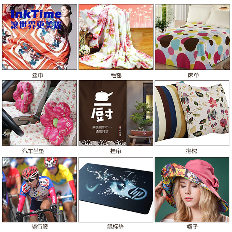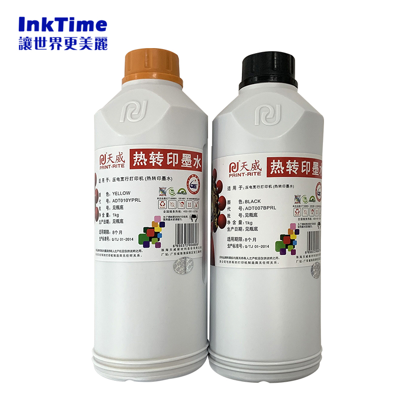 inktime旗下研发生产与销售一体机的热升华墨水包括代理天威墨水,inktime专用墨水、高端墨水、高浓度热转印墨水等,低速印花机基本是选用的1000ml瓶装数码纺织印花涤纶化纤转印墨水,高速八喷头打印机主要配套5KG罐装超高浓度墨水,更省墨,流畅度更高更低成本配合超薄35g热升华纸;我们针对不同的产能以及客户材料印花制定配套合适的印花方案,专注数码印花打印机及耗材15年,需要更多的咨询可以联系我们客服。